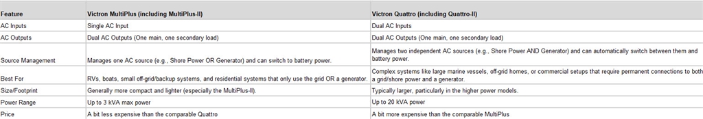 The main difference between the Victron MultiPlus and Quattro is that the Quattro has two AC inputs and two AC outputs, allowing it to connect to two independent AC sources, while the MultiPlus has one AC input and output. This means the Quattro can automatically switch between two separate AC power sources, such as grid power and a generator, while the MultiPlus can only switch between one AC source and battery power. Here is a breakdown of the key distinctions: